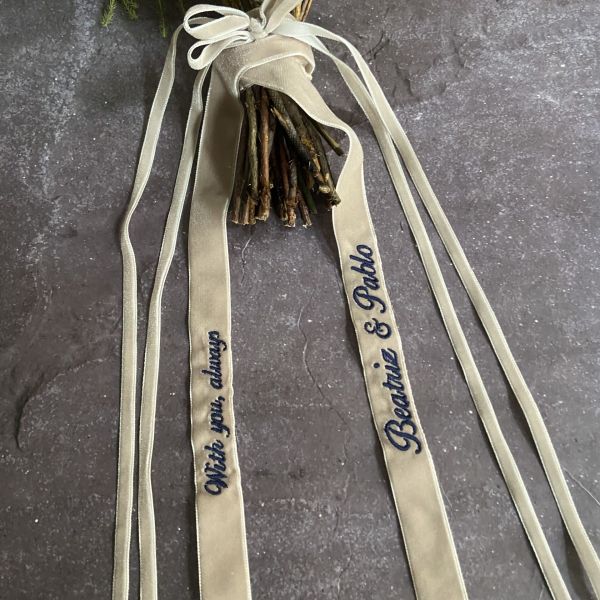 Cojín porta alianzas personalizado con telas y bordados.