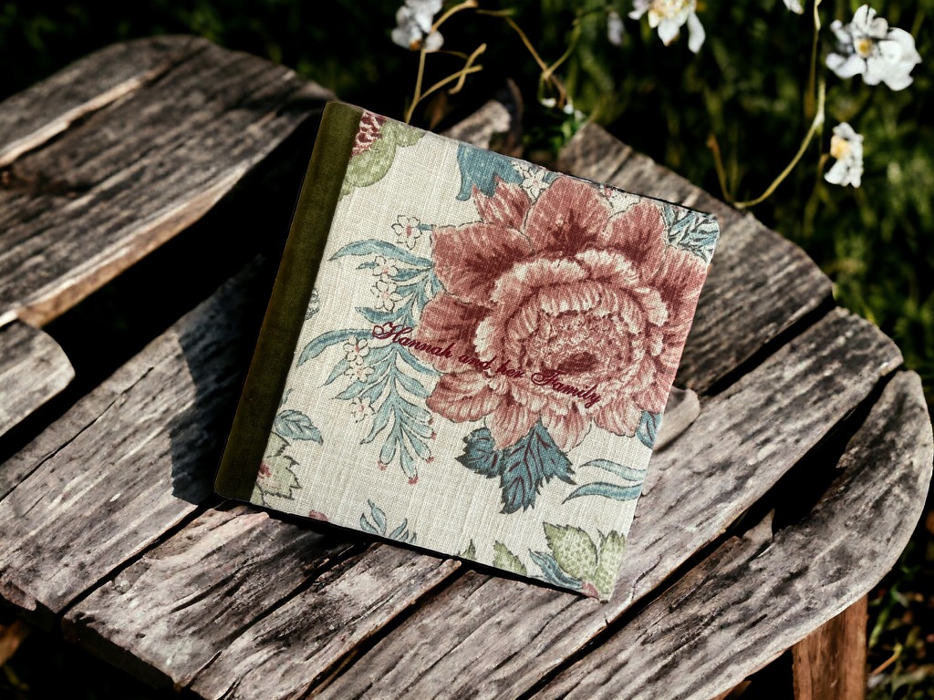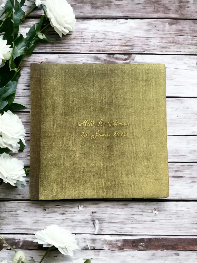 Telas en tonos naturales, bordados dorados o neutros, interiores de papel artístico cuidadosamente encuadernado.
