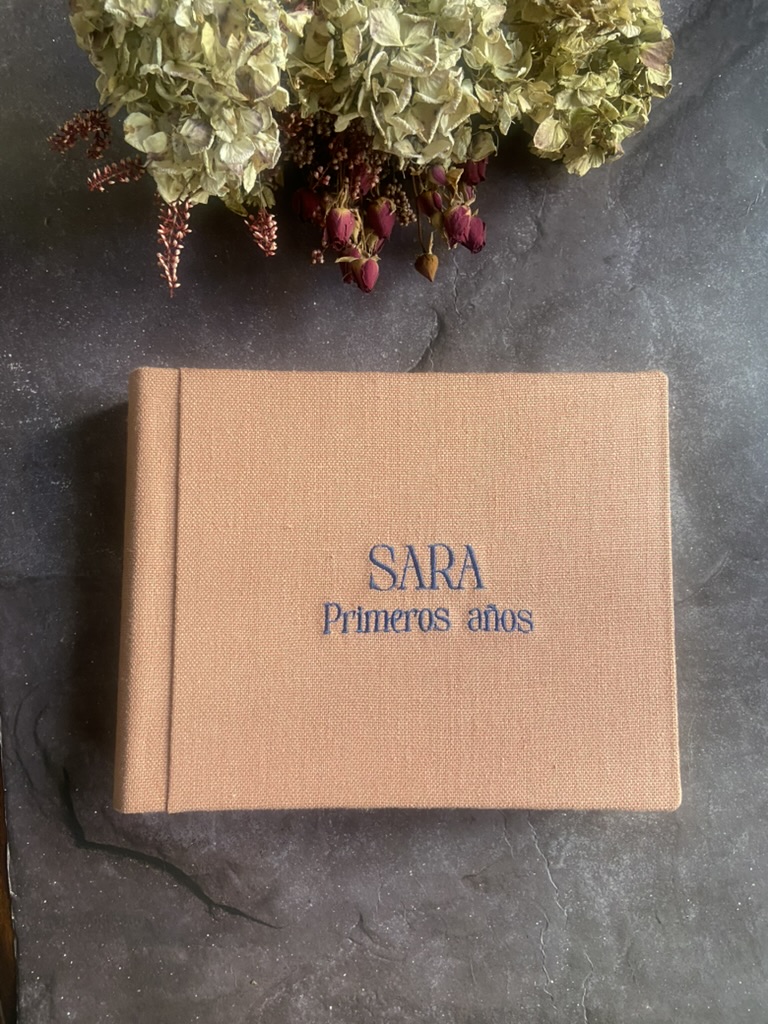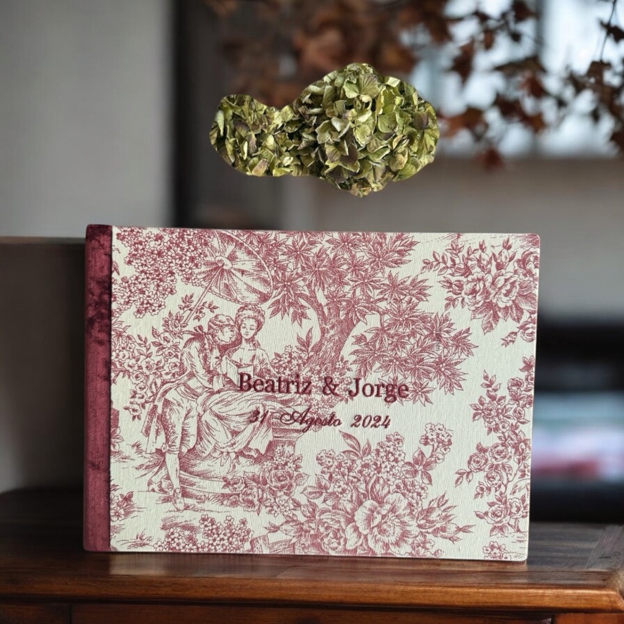Telas en tonos naturales, bordados dorados o neutros, interiores de papel artístico cuidadosamente encuadernado.