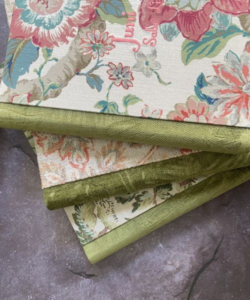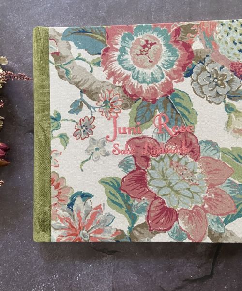 Tapas: Tres álbumes tradicionales para pegar fotografías, creados con combinaciones únicas de telas en tonos verdes, naranjas, rosas y azules, que aportan armonía, frescura y un carácter distintivo a cada pieza.
