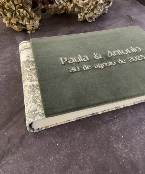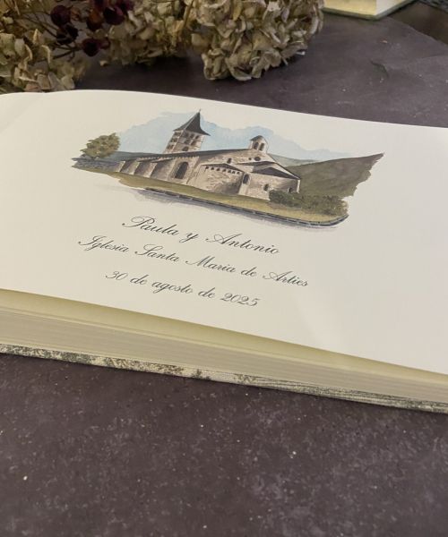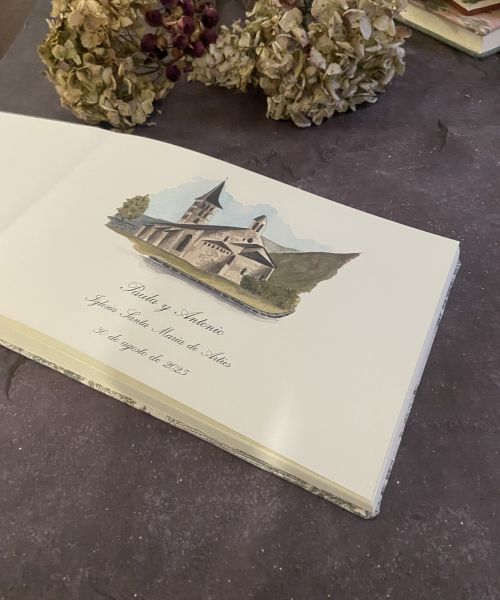 El diseño seleccionado combina sobriedad y frescura, con un formato horizontal que acompaña la estética elegante y luminosa de su celebración. Cada detalle fue cuidadosamente elegido: la impresión personalizada de la acuarela y de los testigos, la armonía de las telas seleccionadas y el bordado delicado que realza la portada con sutileza.