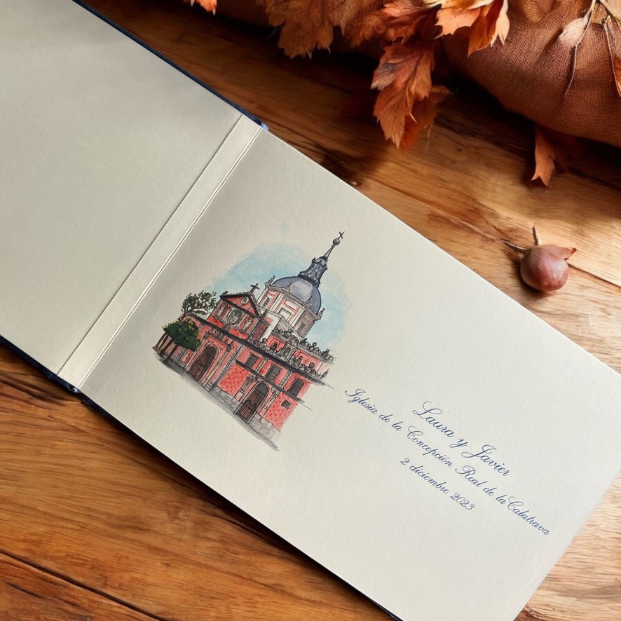 Este modelo combina el clásico libro de firmas artesanal con un álbum de fotografías. En la primera página se puede incluir una ilustración personalizada. También se ofrece la posibilidad de incluir caligrafía artística para los nombres, lugar y fecha de la boda. Libros de firmas: firmas y fotosA diferencia del modelo anterior, no se imprimen los testigos. En su lugar, nuestra ilustradora los caligrafía a mano si se contrata el servicio. El resto de las páginas quedan en blanco para pegar fotos analógicas de la boda.