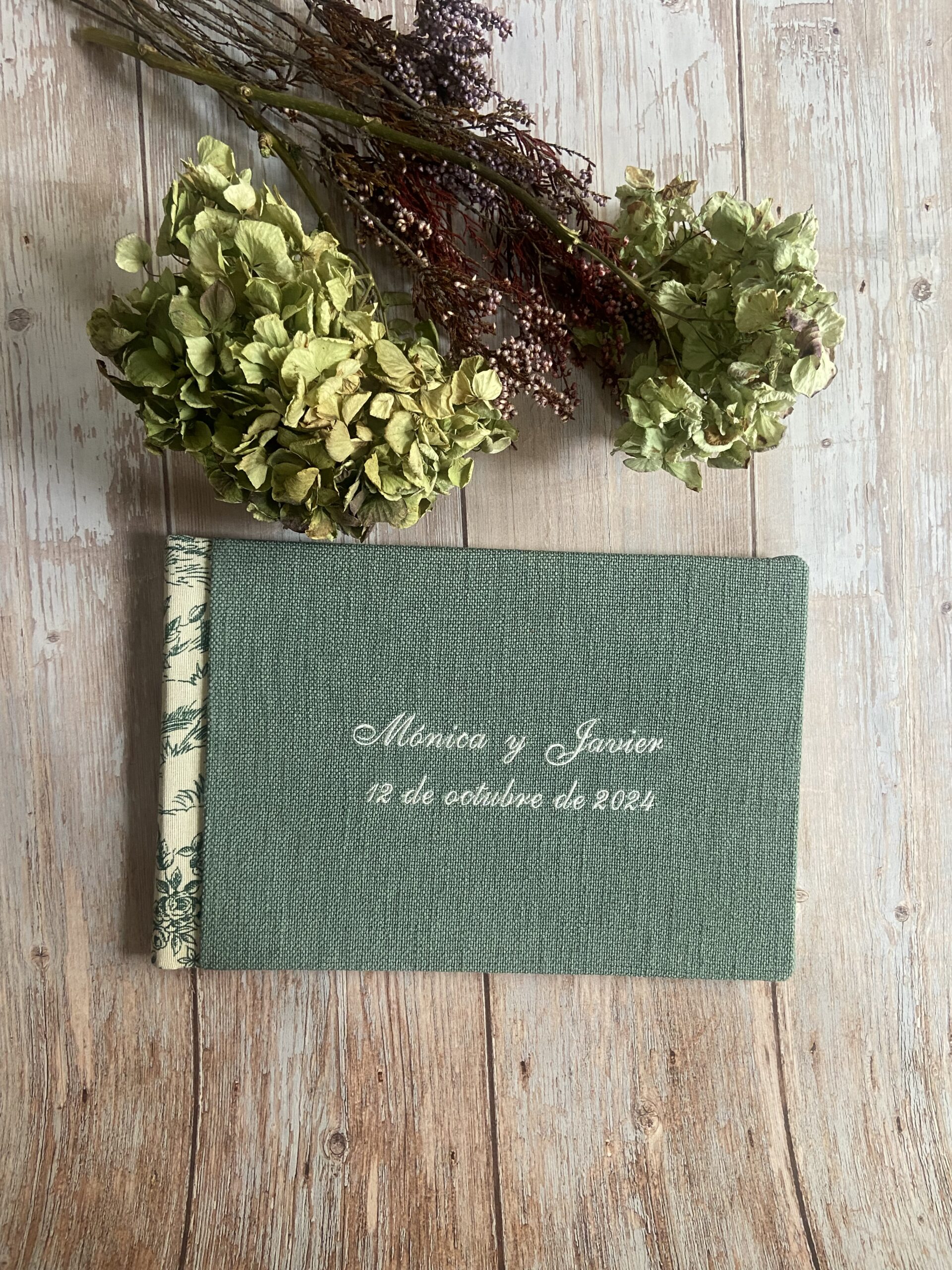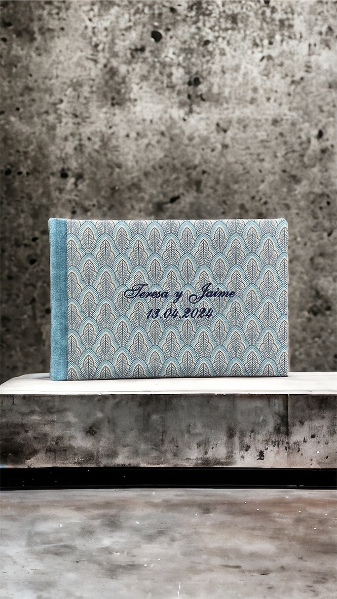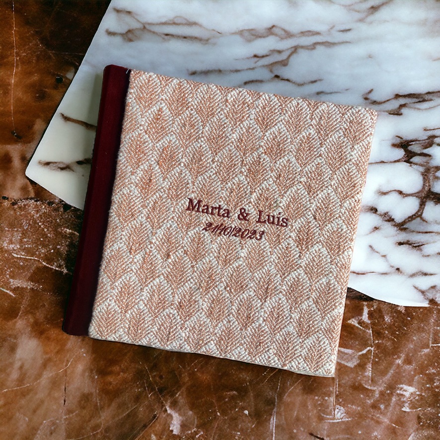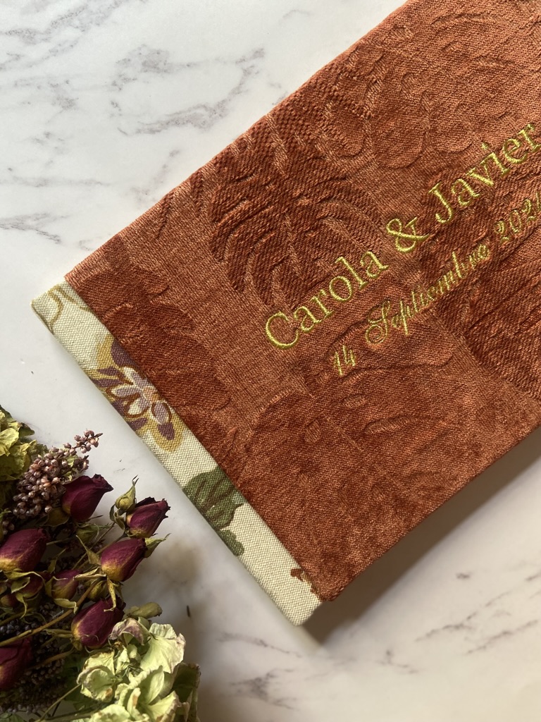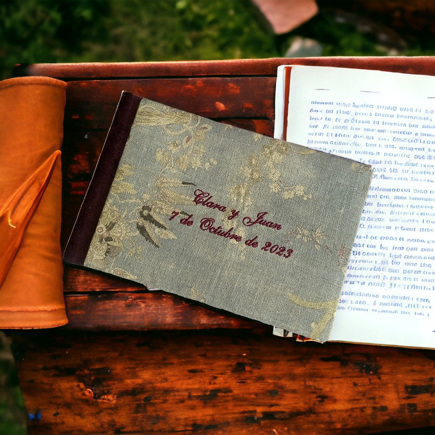 Otra opción para personalizar la tapa del libro es añadir bordados, que pueden incluir vuestros nombres, la fecha de la boda o incluso algún símbolo especial que represente vuestra relación. Los bordados añaden un toque elegante y son especialmente populares en bodas con un estilo clásico o rústico.