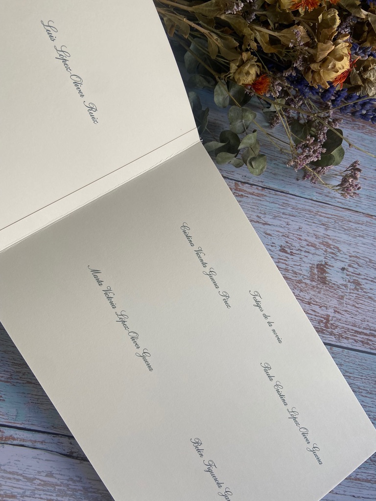 Para aquellos que no disponéis de una acuarela o no tenéis pensado encargar una, ¡no os preocupéis! También hemos pensado en esta opción dentro de nuestros libros de firmas. En este caso, la primera página, una vez abierto el libro, incluiría tres líneas con un contexto especial, que podría estar bien impreso o bien realizado en caligrafía artística. El texto consistiría en vuestros nombres, el lugar de la ceremonia y la fecha de la misma, todo perfectamente centrado en la primera página. A continuación, las siguientes páginas estarían dedicadas a los mensajes y firmas de los testigos. Esta opción está disponible tanto con la impresión del texto en las páginas como con la elegancia de la caligrafía artística.