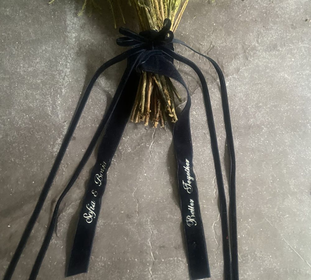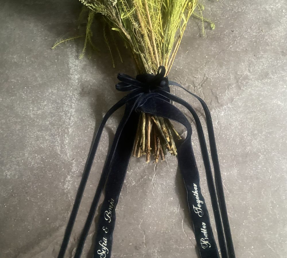 • Nuestras cintas bordadas para ramo de novia están pensadas para acompañar uno de los momentos más especiales de tu vida. Confeccionadas en terciopelo azul marino, aportan elegancia, personalidad y un acabado atemporal a tu ramo.