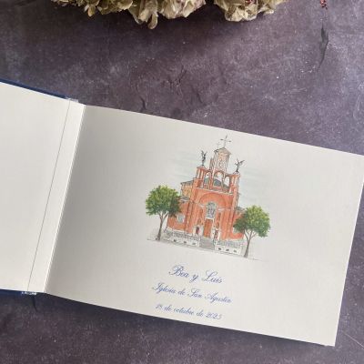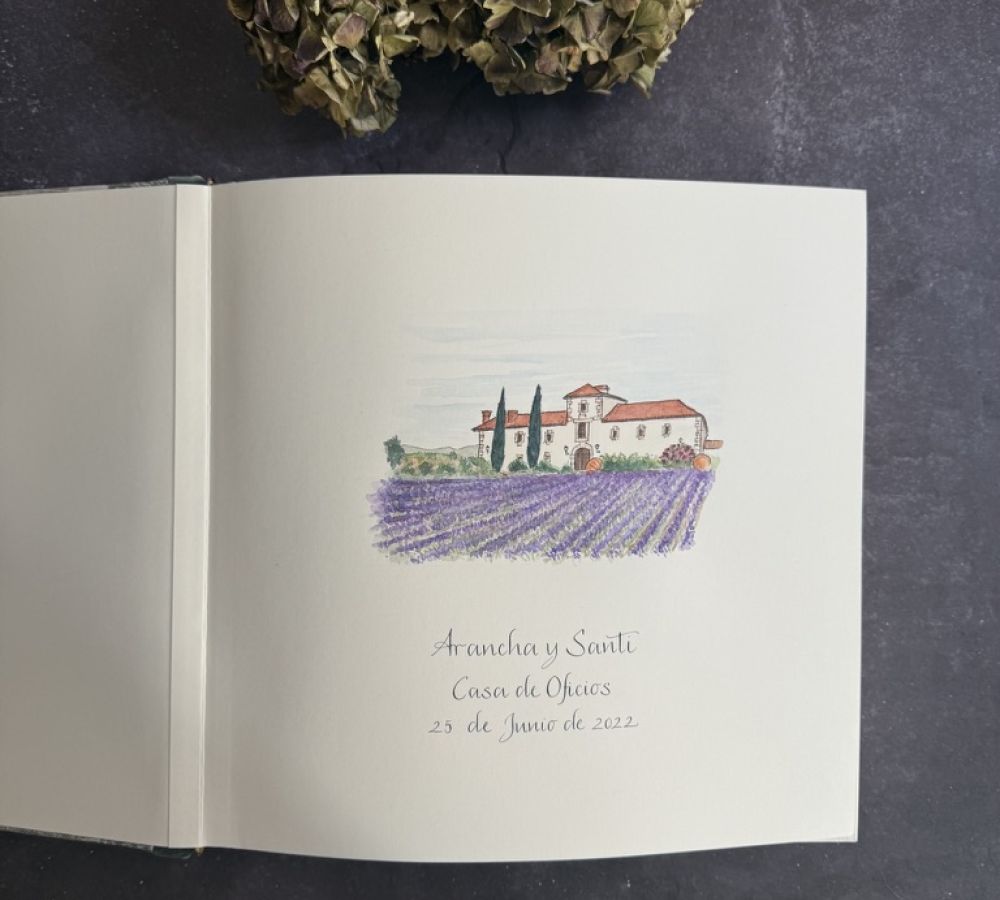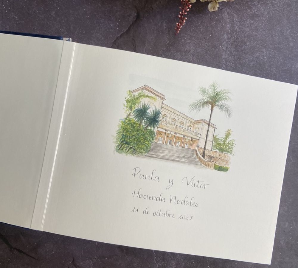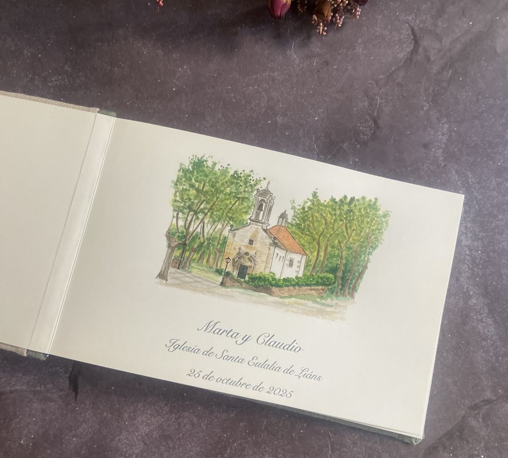 🎨 Acuarela – Puede añadirse: (1) Por encargo o (2) Acuarela proporcionada por el cliente, que imprimimos aparte y colocamos en la 1ª página con efecto relieve. Coste: 19 €, a abonar por transferencia bancaria tras realizar el pedido.