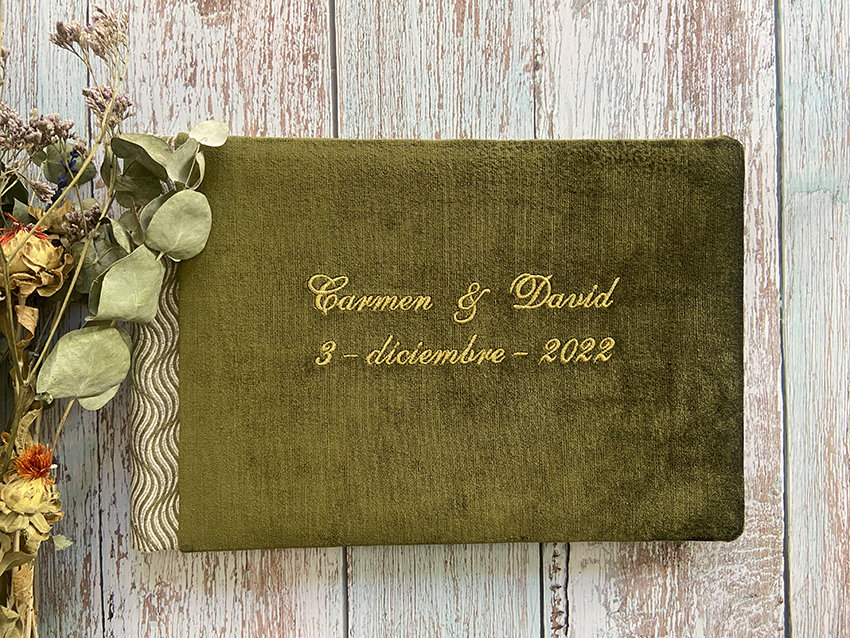 A primeira opção para personalizar um livro de assinaturas é a impressão de aquarela e nomes das testemunhas. Nesse formato, o livro de assinaturas tem um tamanho único de 30 x 20 cm, com um mínimo de 10 páginas e um máximo de 60 páginas. O número de páginas é escolhido de acordo com as necessidades do casal, levando em consideração o número de testemunhas. Costumamos colocar 4 nomes por página, deixando as páginas traseiras em branco.Esse formato permite a personalização da capa do livro com tecidos selecionados de nosso catálogo e bordados que incluem os nomes dos noivos ou detalhes especiais, como a data do casamento. Além disso, a impressão dos nomes das testemunhas no interior do livro adiciona um toque exclusivo, pois os nomes das pessoas mais próximas dos noivos podem ser incluídos, fazendo com que cada página tenha um significado especial.