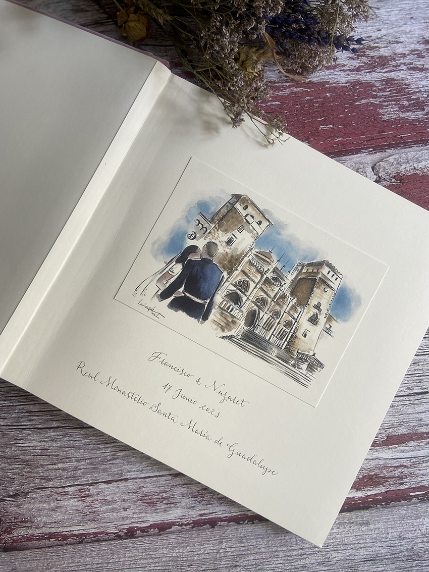 Nuestros álbumes híbridos ofrecen una variedad de tamaños y la opción de incluir o no hojas de seda entre página y página, permitiendo a cada pareja personalizar su álbum según sus preferencias y necesidades. La primera página, que actúa como pieza central del álbum, es donde nuestra magia comienza. Ofrecemos el servicio exclusivo de acuarela, donde nuestro equipo de ilustradores profesionales, verdaderos artistas en su oficio, crean una ilustración basada en una fotografía proporcionada por los novios del lugar de la ceremonia. Estas acuarelas no son solo dibujos; son las más bellas representaciones del amor y el compromiso, capturando la esencia del día más importante de vuestras vidas.