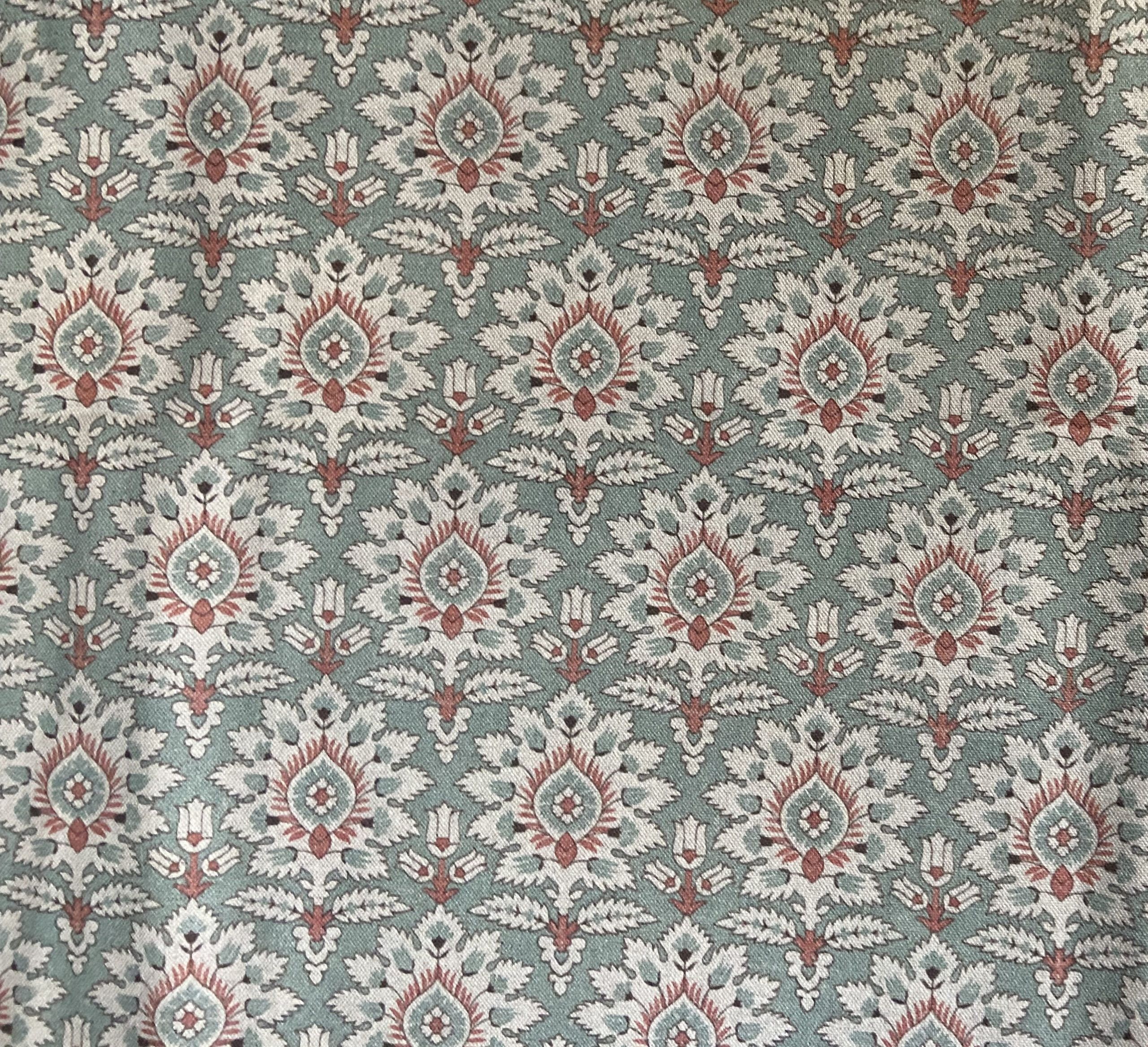 «Royal Golden » con estampado floral geométrico clásico, en tonos verde salviarojo teja y beige suave. Su diseño atemporal y elegante, inspirado en motivos botánicos, aporta calidez y sofisticación.