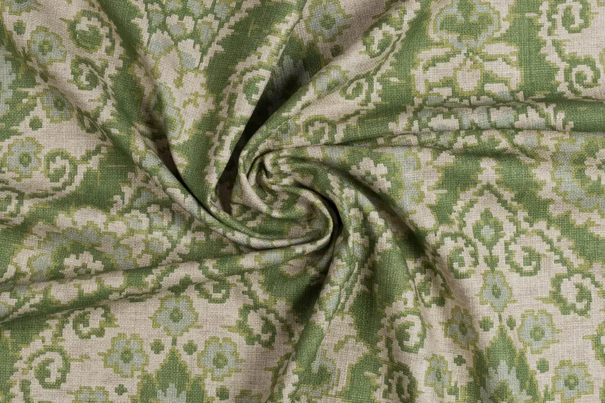 «Sahara Green» Inspiración damasco reinterpretado sobre una base cruda de cáñamo y algodón.
